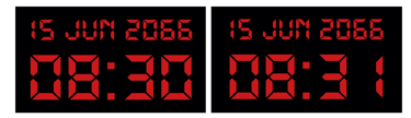 Ważnym akcentem instalacji były dwa płaskie telewizory zawieszone wysoko, ustawione równolegle do siebie, na których ekranach wyświetlał się zegar pokazujący datę i godzinę: 8:30, 15 czerwca 2066 roku. Co pewien czas godzina zmieniała się z 8:30 na 8:31 i następnie powracała, tworząc zapętlony, hipnotyczny rytm, który wzmacniał wrażenie zawieszenia w czasie oraz nieuchronności zdarzeń.