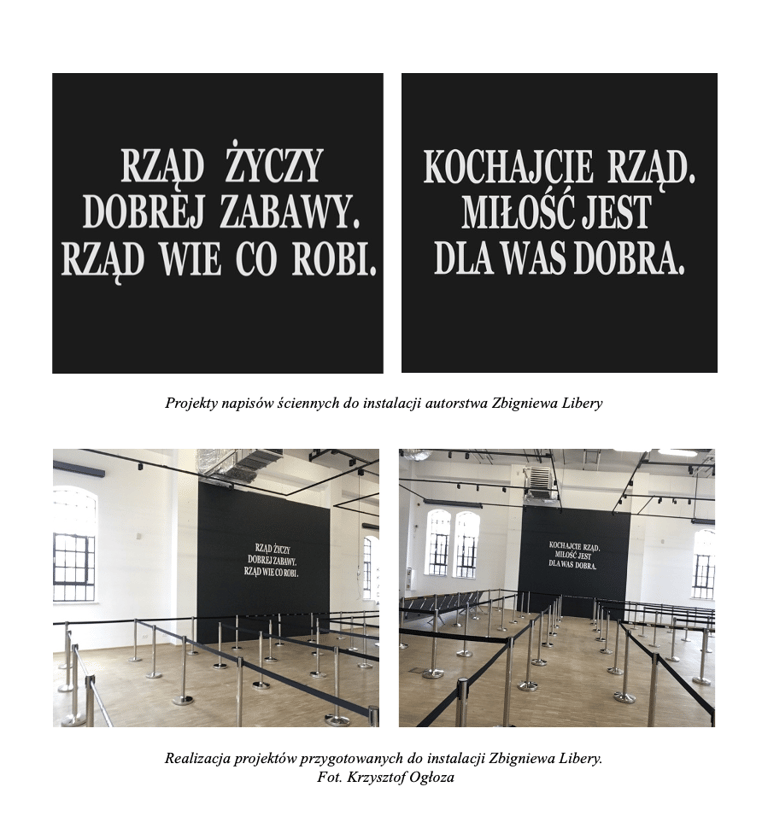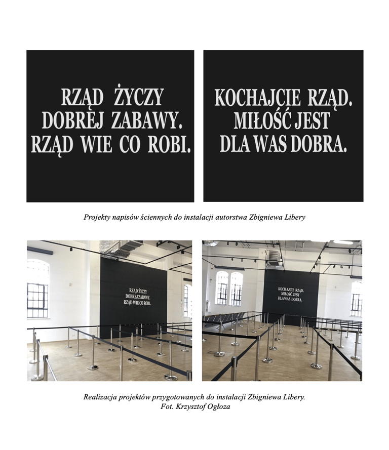 Integralnym i estetycznie dopełniającym elementem przestrzeni były monumentalne hasła, zaczerpnięte bezpośrednio z tekstu Taboriego. Ich obecność na ścianach odwoływała się do motywu propagandy przedstawionej w Przedwczesnym odejściu. Na dwóch bocznych ścianach hali, przemalowanych na czarno, umieszczono ogromne napisy. Na prawej ścianie widniał slogan: RZĄD ŻYCZY DOBREJ ZABAWY. RZĄD WIE, CO ROBI. Na lewej: KOCHAJCIE RZĄD. MIŁOŚĆ JEST DLA WAS DOBRA.